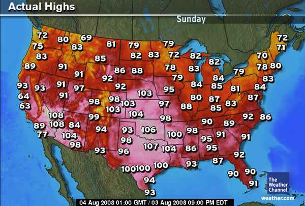 ALL August 2008 high temperatures of 90 F or higher are in RED.